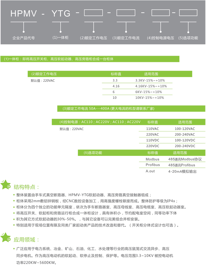 ◆ 整體裝置由手車式真空斷路器、HPMV-YTG軟起動(dòng)器、高壓旁路真空接觸器組成;
